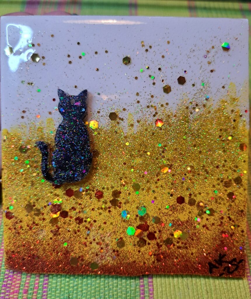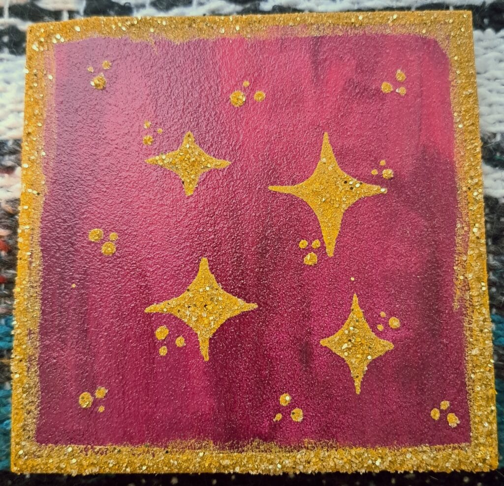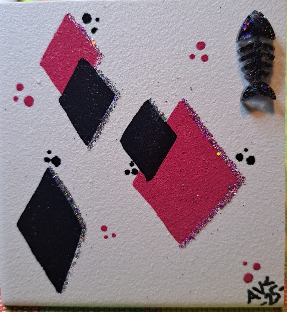 Mostly painted with enamel paint. Used glitter and resin for extra sparkle ✨ As a base I’ve practiced on bathroom tiles mostly. Also pieces of plastic boards.